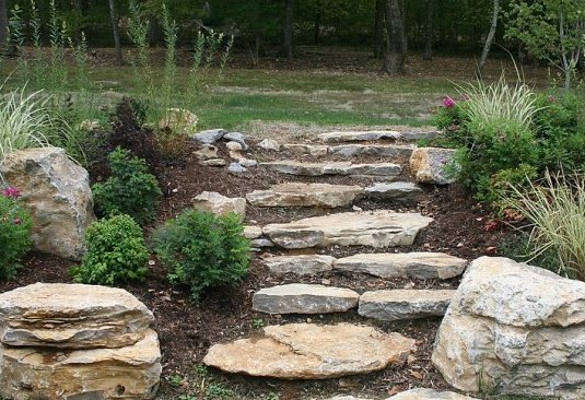 Flagstone Patio set in concrete base, Fireplace with hearth, mantle and seating wall, as well as landscaping