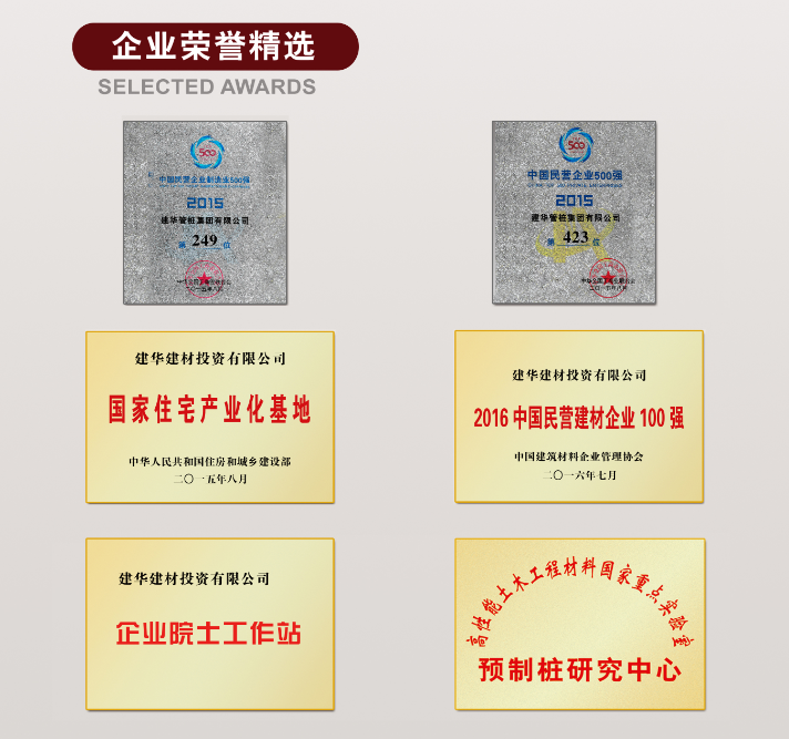 建华建材集团,混凝土制品与技术综合服务商,国家住宅产业化基地,创建于 1993 年,其前身是建华管桩集团。建华建材集团自创立之日起,一直坚持“走正道、负责任、心中有别人”的企业文化,遵循“以人为本,无为而治”的管理理念,坚守“用户第一,信誉至上”的企业宗旨,弘扬“求实、务实,提高办事效率,参与市场竞争”的企业精神。目前,建华建材的预应力混凝土管桩年生产能力超1.8 亿米,销量在中国市场占有率达 30%以上。集团总人数约 1.6 万人,其中管理人员近 3000 人。