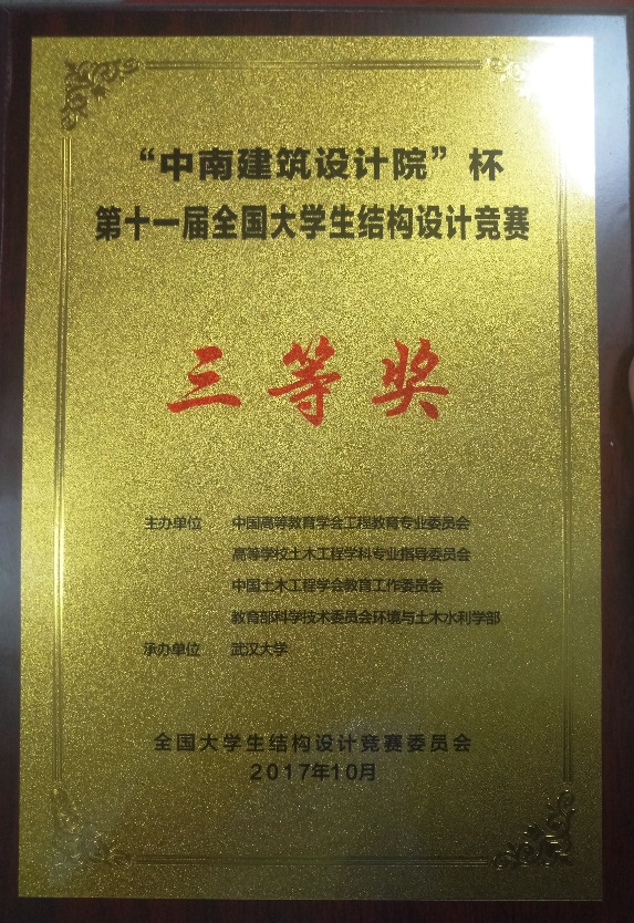 金秋送爽,丹桂飘香,10月18日至22日,第十一届全国大学生结构设计竞赛在武汉大学举行,我院参赛队与来自全国107所高校的108支竞赛队伍、324名土木类专业大学生同台竞技,包括清华大学、同济大学、浙江大学等国内名校。我院参赛队员经过18小时的模型制作和近11小时的模型加载,最终斩获全国大学生结构设计竞赛三等奖。
