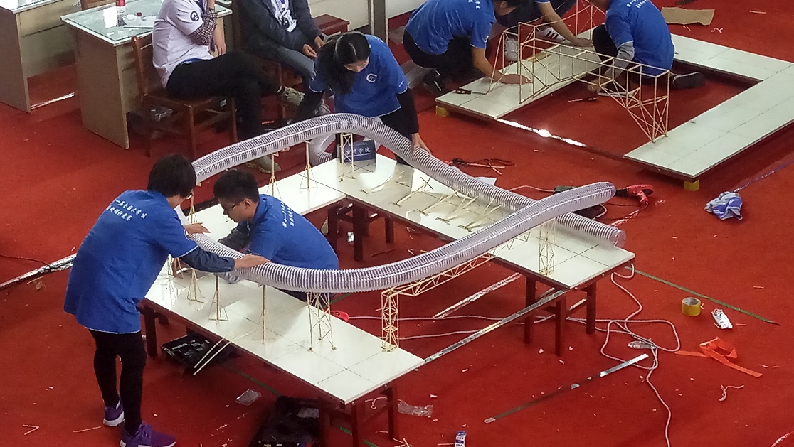 本届赛事以“渡槽支承系统结构设计与制作”为主题,评委会根据参赛队伍提交的计算书、现场模型制作以及模型加载效果等分项评分,最终给出总成绩。在模型制作过程中,每位队员都全力以赴,结构的精巧程度让人眼前一亮,体现了参赛选手对专业知识的灵活应用和对于“渡槽支承系统”结构的奇思妙想。在模型的加载阶段,三位队员细心安装模型,大方地介绍设计理念。在随后的加载过程中,成功完成了加载测试。而与之同行的指导老师也细心记录,交流讨论各组参赛模型的优劣之处,将踏实严谨、勇于创新的土木精神在实践中充分传承。