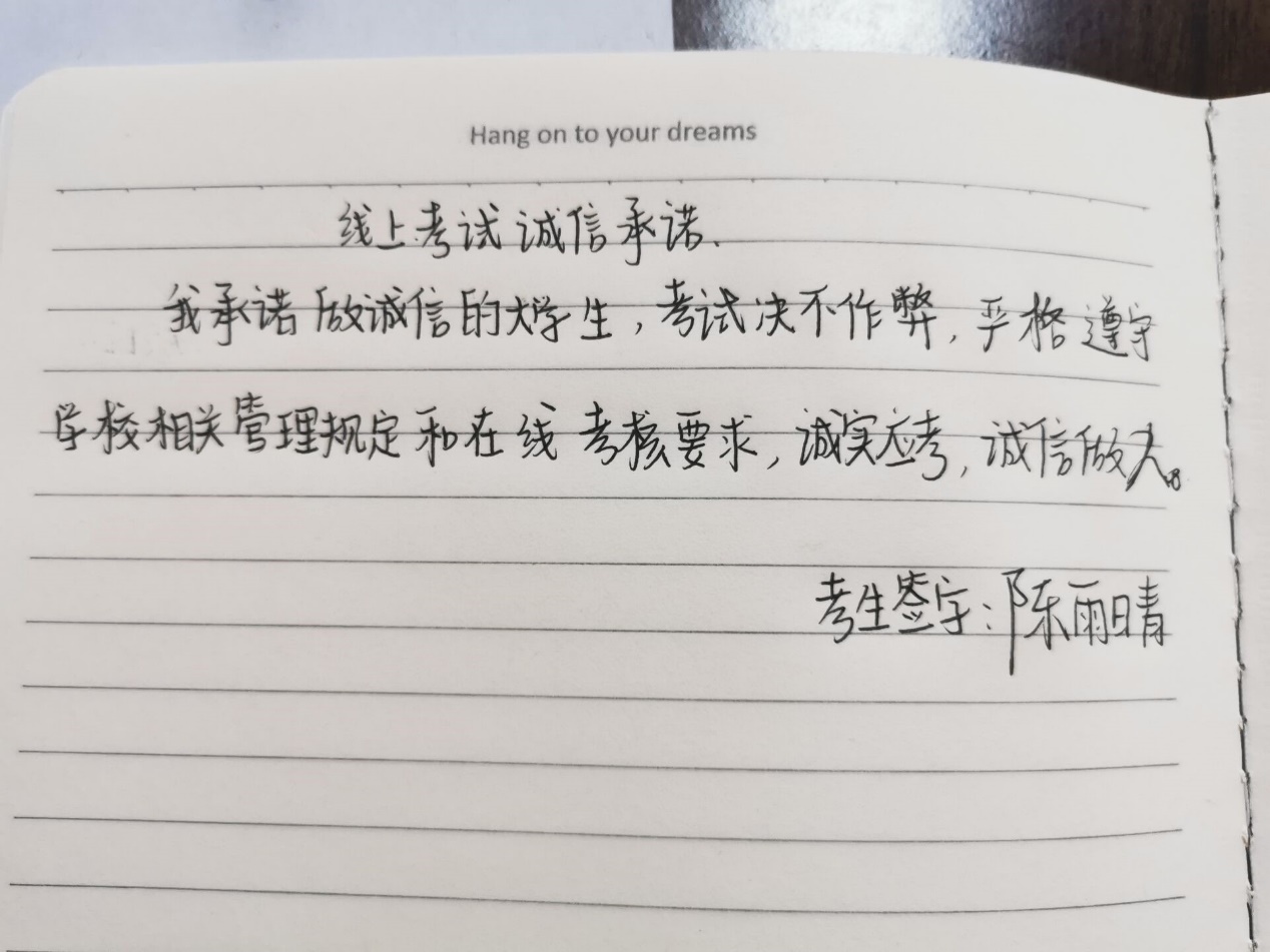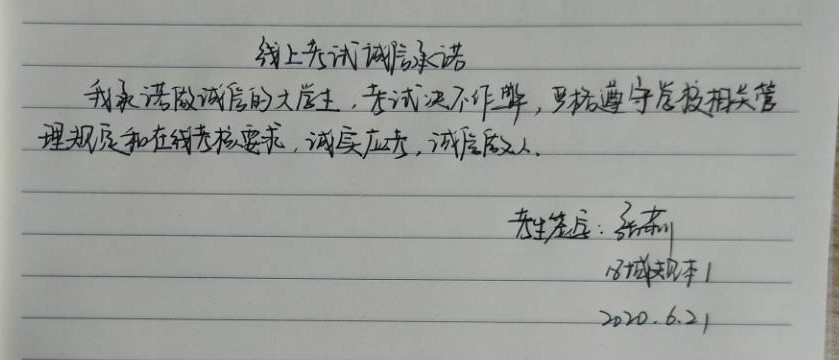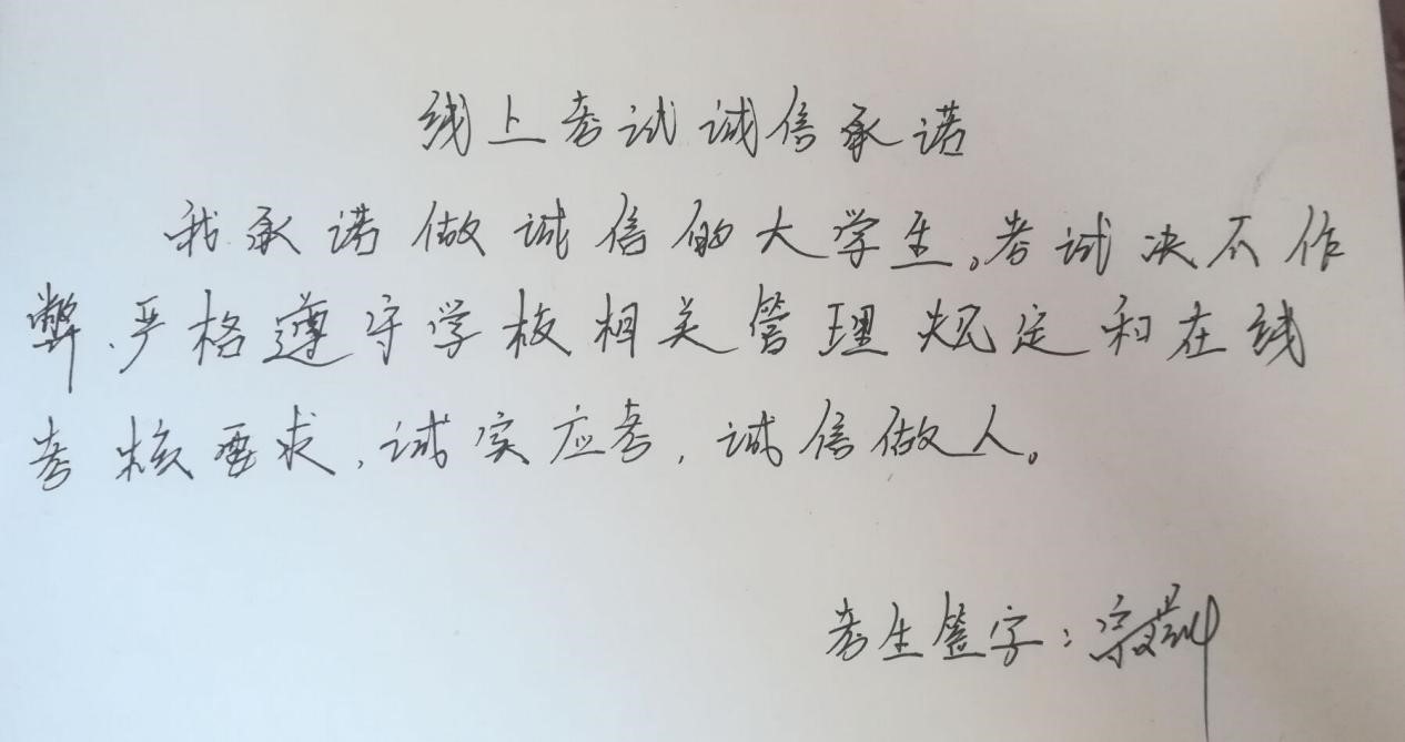 全体同学书写了诚信考试承诺书,并郑重签下了自己的名字,充分展现了同学们诚信考试的坚定决心。