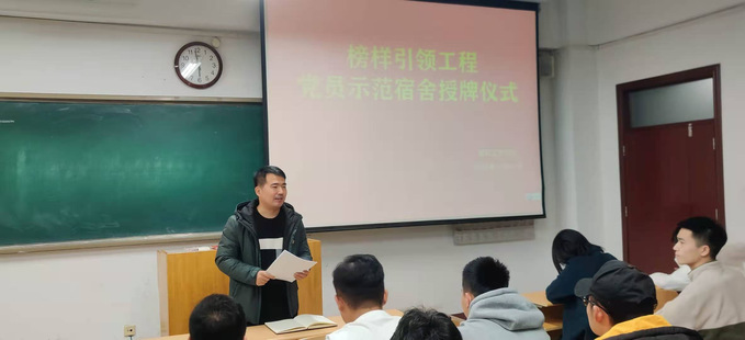 随后,董老师为党员示范宿舍授牌,并指出这既是一份荣誉,更是一份责任,要充分发挥学生党员在同学中的战斗堡垒作用,逐步在全院学生中形成“党员带动群众,群众学习党员”的良好氛围。