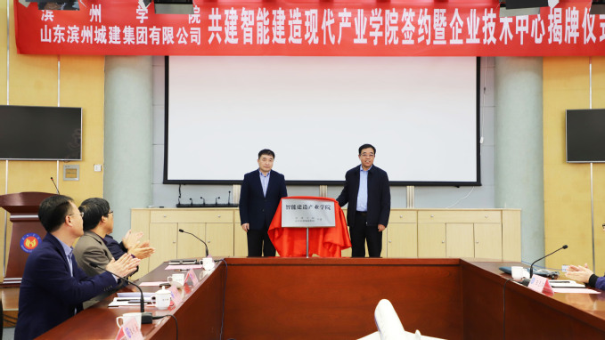 李长海与曹庆训共同为“智能建造现代产业学院”和“山东滨州城建集团企业技术中心”揭牌。