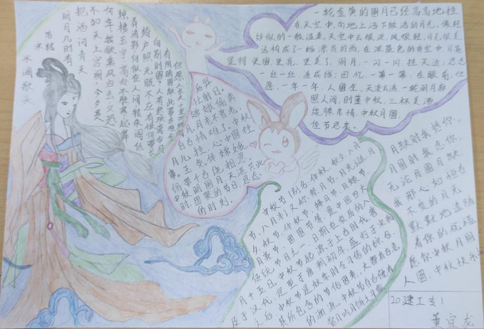 赛前各班代表积极准备,将网上收集的资料结合绘画融入到一张张生动的手抄报中,让大家更加了解到了中秋节的起源,寓意等相关知识。同时同学们的手抄报大多色彩鲜明、内容丰富,构思新颖,画面美观,书写亦是十分规范,展现了同学们积极向上的精神风貌,表达了对中秋节的热爱和对亲人的思念。其中孟赟同学的手抄报更是完美包含了中秋节的由来、风俗习惯、中秋最美诗词等传统文化。此次活动,同学们在娱乐的氛围中提高学习兴趣,在学习的过程中又得到了快乐。比赛结束后,参加活动的同学们纷纷表示感受到了浓厚的节日气氛,体验到了中秋节所带来的满满感动与浓浓情谊。