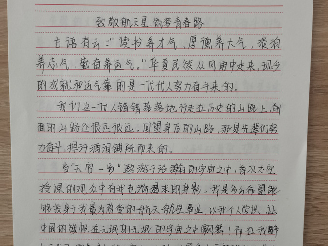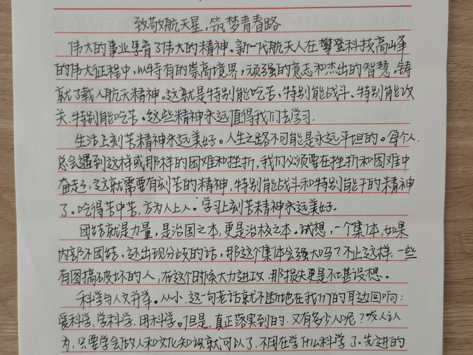 此次活动,同学们紧紧围绕“致敬航天星,筑梦青春路”的主题,以写作的形式,追忆我国的航天发展史,抒发自己对航天英雄、航天科技工作者的敬佩之情。选手们满怀激情,提笔写下一篇篇满含航天情怀的文章,以文字的形式传递出内心的声音,字里行间透露出对老一辈航天人矢志不渝的报国心、孜孜以求的强国梦、用青春和热血铸就的航天精神的崇拜,对航天科技工作者的尊敬、对青春的感悟,表达出我院学生展现出同学们立志传承航天精神、坚持以青春之我,拼搏奋斗的决心。