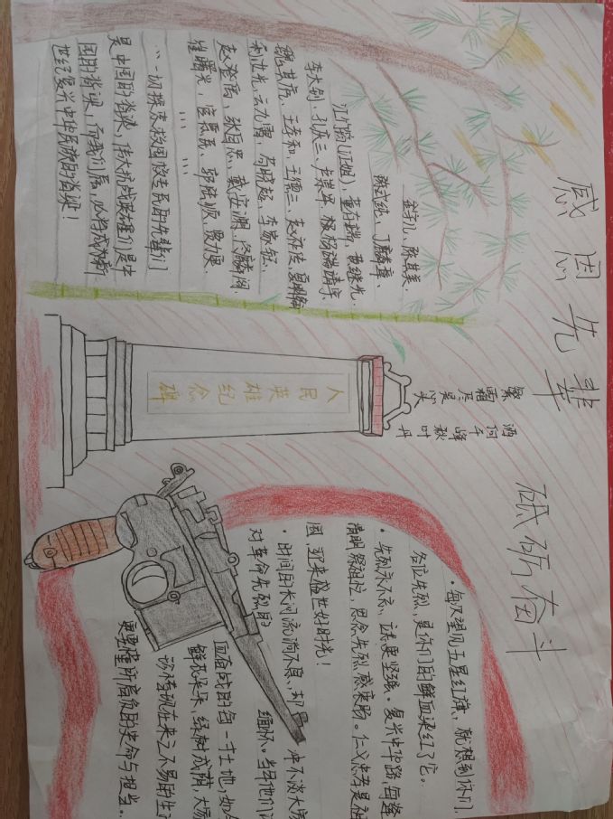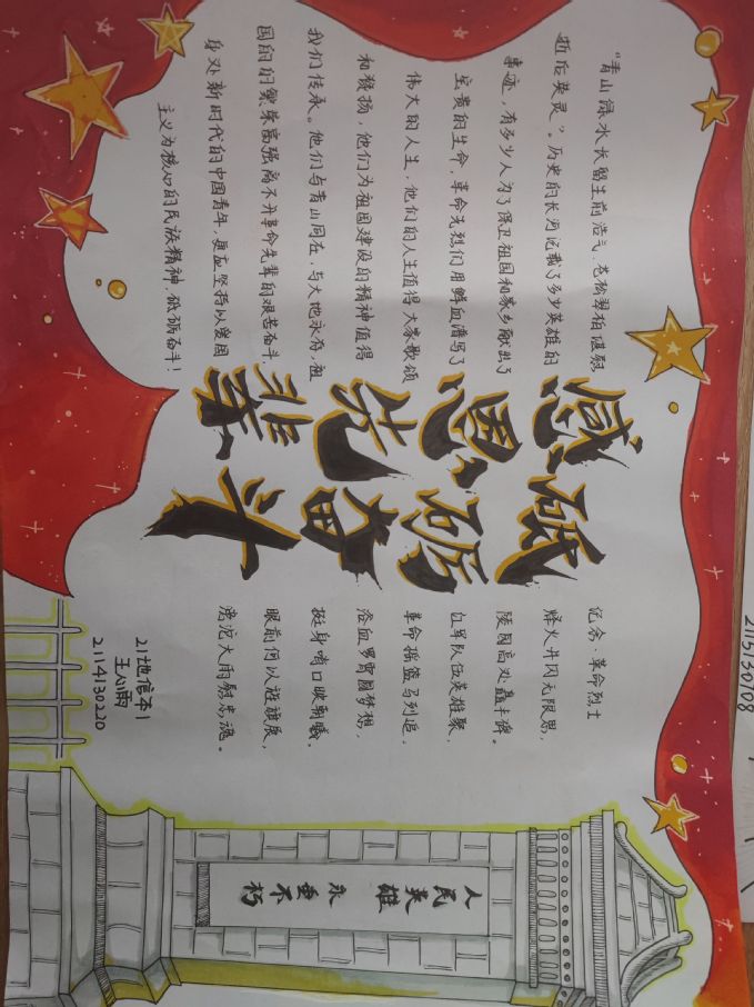 同学们以手抄报的形式,传承中华民族无数先辈优秀爱国精神,营造出爱国、感恩、奋斗的良好氛围,在同学们递交的作品中,版面构思新颖,采编内容充实,创作思路新奇,色彩明丽,内容充实。在设计手抄报的同时,同学们对先辈的精神认知进一步提高,有的展现多个先辈无私奉献精神,既有描绘先辈英勇牺牲的场面,又有描绘出中华人民共和国成立以来各个先辈的奋斗精神……震撼人心,仿佛可以透过白纸窥得那段哀痛悲伤的斑驳岁月。同学们仅用小小一张纸,描绘出先辈的优秀精神,牢记先辈优秀精神,对先烈们的缅怀发挥的淋漓尽致,创作出了一张张极富情感的作品。相关评比人秉承公平公正的原则审核打分。至此,活动顺利结束。