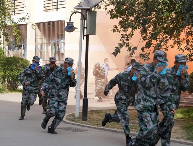 在本次演练应急疏散环节,消防工作人员提前入场,在预设的11号宿舍楼4楼点燃烟雾,随后拉响消防警报,2022年全体新生消防应急疏散演练正式开始。广播播放安全疏散通知,安全负责人员立即联系应急救援组请求指挥并模拟拨打校园“110”报警援助。紧接着,各楼层2022级学生立即使用毛巾或衣物捂住口鼻,以低姿迅速、有序地逐层从安全出口进行疏散,到达雷锋广场集合并清点人数。最后消防站队员驾驶消防车赶至学生宿舍楼下进行火情处理。
