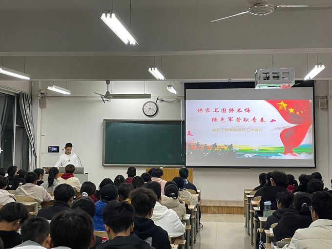 军为国之柄,强国必强军。为响应国家号召,锚定新时代强军目标、响应我国建设世界一流的军队的召唤,激发我院学生热爱国防、建设国防的政治热情。11月4日,建筑工程学院于九教404室举办“保家卫国终不悔,绿色军营献青春”征兵宣传活动。建筑工程学院2022级新生参加了本次活动。