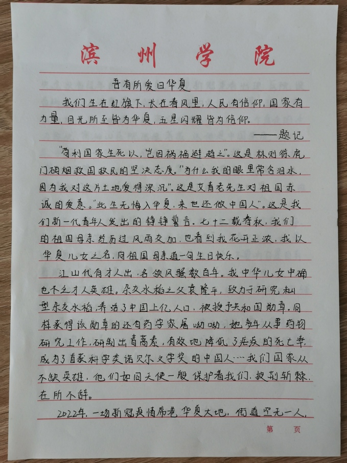 爱国主义是民族精神的核心,是实现中华民族伟大复兴永不枯竭的精神动力。同学们提笔落于纸上,字字真情,写下了对祖国无限的崇敬和满心的热爱,抒发了对伟大祖国繁荣昌盛、和谐富强的衷心祝愿。随后,同学们提交自己的作品。最后,评委小组秉承着公平公正的态度,分别从文章内容、表达方式和文章立意等方面进行评分。活动结束后,同学们也纷纷表示:通过提笔成文的方式抒发爱国之情,今后更要担起民族复兴的时代使命,作为新时代青年要坚定不移听党话、跟党走,让爱国主义的伟大旗帜永远在心中高高飘扬。至此,活动圆满结束。