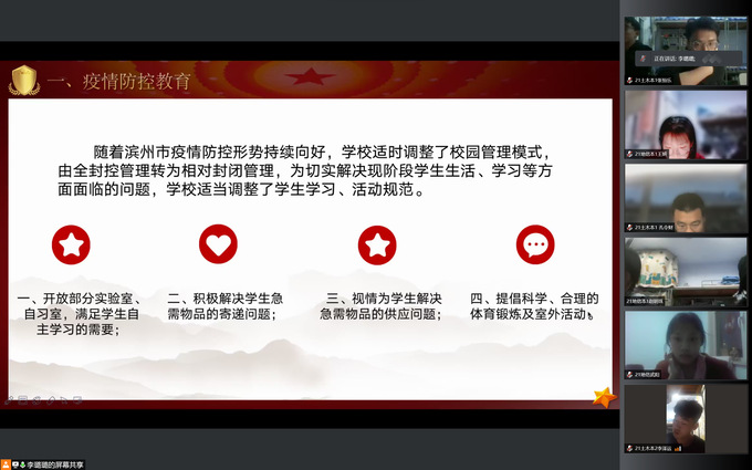 在此次特别的线上主题团日活动中,我院各团支部支书为支部成员系统地介绍了学校的防控政策,并引导支部成员牢固树立责任意识,积极配合参与学校疫情防控工作。各团支部号召支部成员严格遵守疫情防控要求,提高防控意识,主动远离、积极澄清消极虚假信息,做到不造谣、不信谣、不传谣,并向支部成员解读了学校的防疫政策,宣讲了防疫知识,引导团员青年提高政治站位,树立大局意识。各团员纷纷表示,此次主题团日活动使同学们了解了当下疫情的严峻态势,强化了各团员青年疫情防控认识,鼓励引导同学们抗击疫情不松懈。至此,活动圆满结束。
