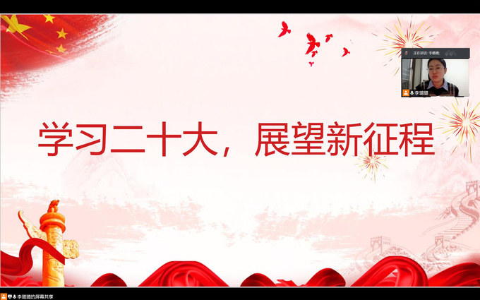 活动由网络会议的形式召开,团总支书记董志强出席并主持此次活动。活动伊始,辅导员李璐璐老师带领与会学生回顾党的二十大的重要内容,并对党的二十大中所涉及的重要教育思想和理念进行讲解,随后,组织学生代表就“团员应如何学习和弘扬党的二十大精神”相关问题展开讨论,各学生有序完成发言。讨论结束后,董老师指出,作为团员青年,要坚定理想信念,成长为德智体美劳全面发展的社会主义建设者和接班人;同时,作为团的干部,要永远跟党走、积极承担责任,努力为实现中华民族伟大复兴的中国梦而不懈奋斗。