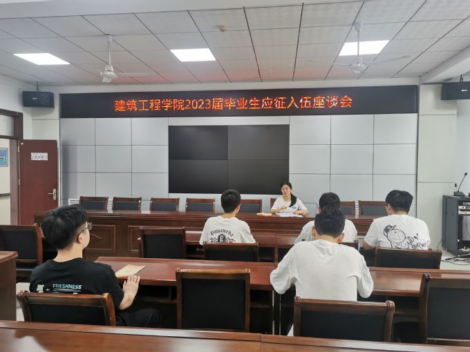 为深入宣传大学生应征入伍政策,点燃大学生参军热情,5月17日至5月21日,建筑工程学院分批次召开2023届毕业生应征入伍座谈会。辅导员李璐璐主持会议。2023届毕业生参加本次会议。