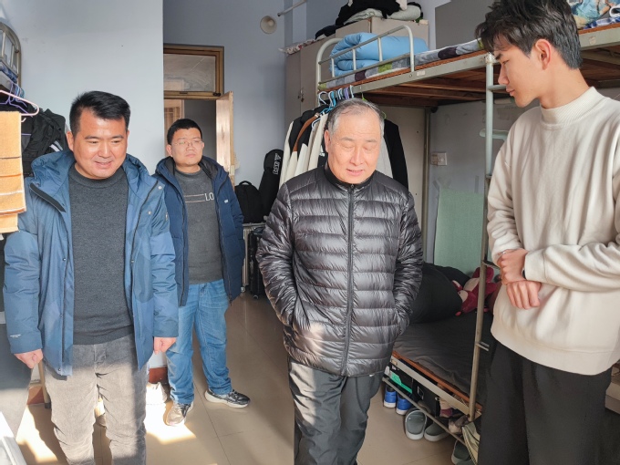 随后,老师们走访了学生宿舍,与同学们进行了深入交流,详细查看了学生宿舍供暖情况,叮嘱同学们提高安全防范意识,加强体质锻炼,注意天气变化,做好流感防护,要保持好宿舍卫生,经常对宿舍进行消毒消杀。韩书记勉励同学们要珍惜美好的青春时光,扎实学好专业知识,努力提高综合素养,保持健康的生活作息,争做德智体美劳全面发展的新时代大学生。