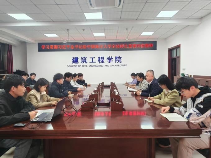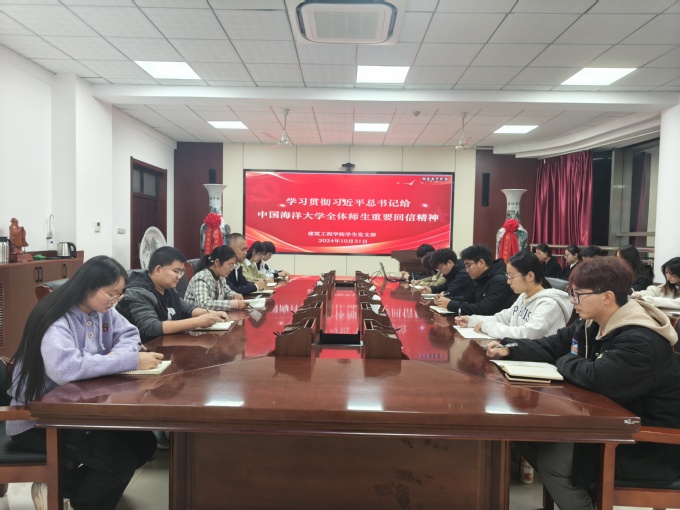 为深入学习宣传贯彻习近平总书记给中国海洋大学全体师生的重要回信精神,切实把习近平总书记给中国海洋大学全体师生重要回信精神转化为推动青年学子发展的思想指引与不竭动力, 10月31日,建筑工程学院学生党支部开展了“学习宣传贯彻习近平总书记给中国海洋大学全体师生重要回信精神”主题党日活动。