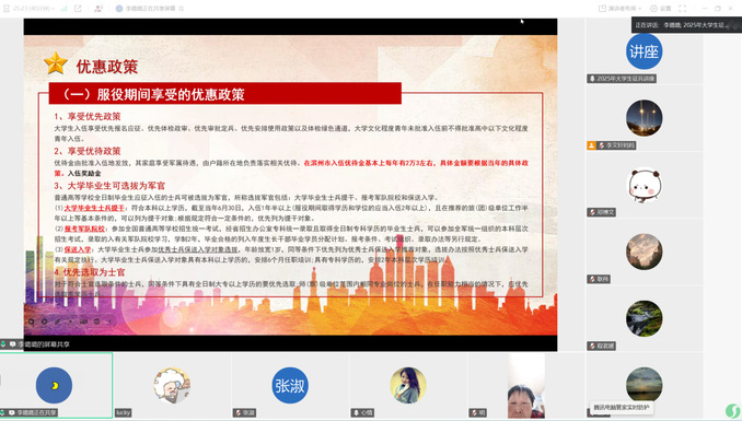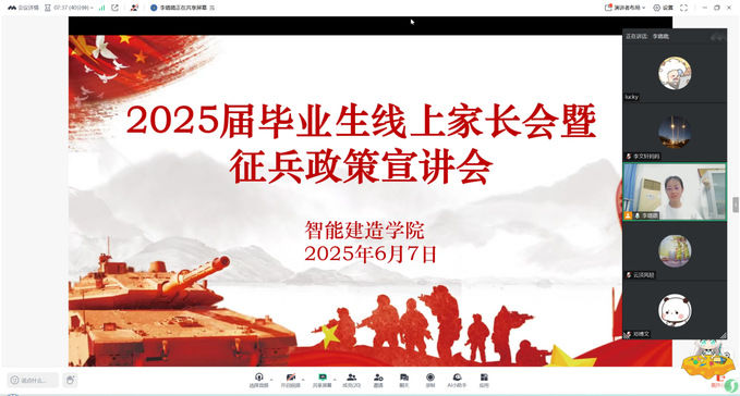 为进一步加强家校沟通,增进家长对学生就业及征兵政策的了解,同时积极响应国家征兵号召,鼓励毕业生投身军旅,6月7日,我院通过腾讯会议成功举办了2025届毕业生家长会暨征兵政策宣讲会,辅导员李璐璐主持,部分毕业生家长参会。