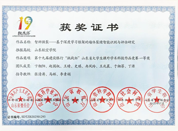 近日,第十九届建设银行“挑战杯”山东省大学生课外学术科技作品竞赛结果揭晓。我院《智辨微裂--基于深度学习框架的墙体裂缝智能识别与评估研究》项目荣获省级一等奖,实现了我院在A类竞赛中的重大突破。